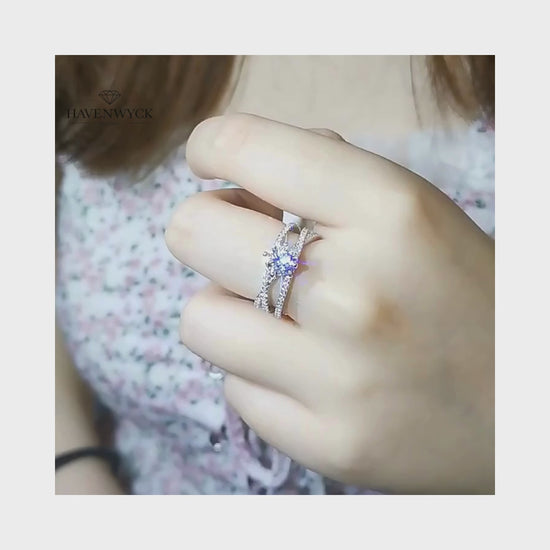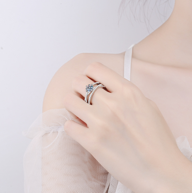 The centerpiece features a dazzling 1 Carat Moissanite stone that radiates exceptional brilliance and fire. Its elegant wave-style band and modern geometric design combine sophistication with a fashionable touch, making it a versatile accessory for any occasion.